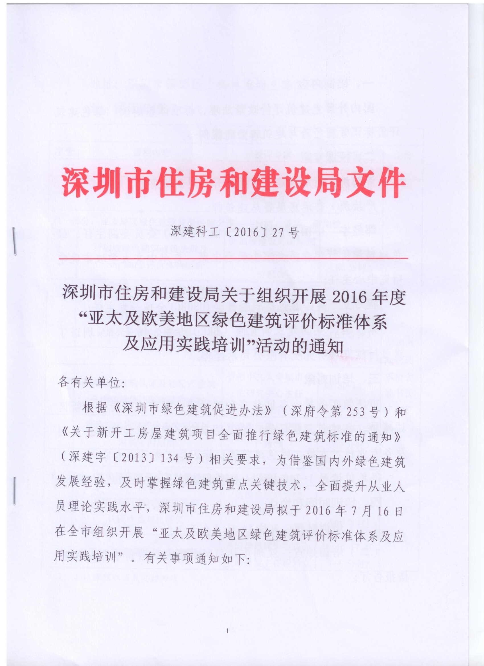 深圳市住房和建設(shè)局關(guān)于組織開(kāi)展2016年度“亞太及歐美地區(qū)綠色建筑評(píng)價(jià)標(biāo)準(zhǔn)體系及應(yīng)用實(shí)踐培訓(xùn)”通知