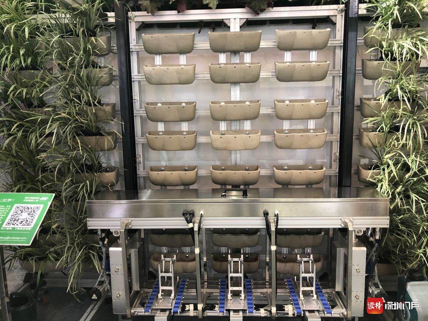 花盆安裝在金屬腳手架上,花盆為標準化設(shè)計,由機器人取放植物并對其修剪,剪下的枝葉通過傳送帶被統(tǒng)一收納。墻面上還設(shè)置由給排水管等形成的灌溉系統(tǒng),當植物生長所需的水分不足,水泵、電磁閥自動開啟,灌溉至土壤濕度達到預設(shè)值。