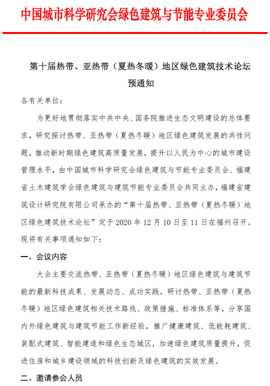 第十屆熱帶、亞熱帶(夏熱冬暖)地區(qū)綠色建筑技術(shù)論壇 預(yù)通知