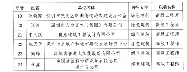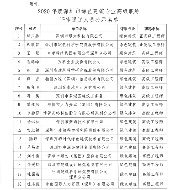 2020年度深圳市綠色建筑專業(yè)高級職稱評審?fù)ㄟ^人員名單公示