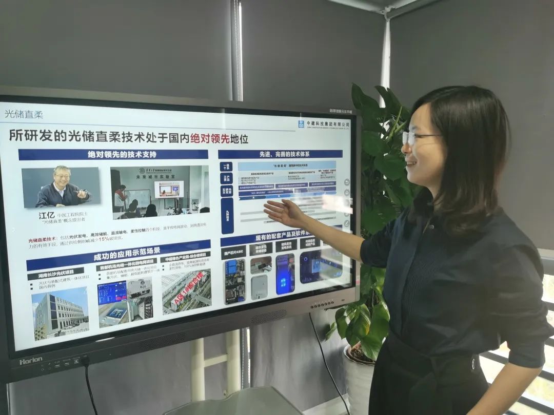 中建科技與清華大學合作研發(fā)的“光儲直柔” 建筑技術是實現(xiàn)建筑領域柔性用能,從而完成大比例可再生能源消納的關鍵技術,是實現(xiàn)建筑碳中和的重要技術手段和有效途徑。圖為中建科技綠色發(fā)展研究中心袁媛博士介紹光儲直柔技術。