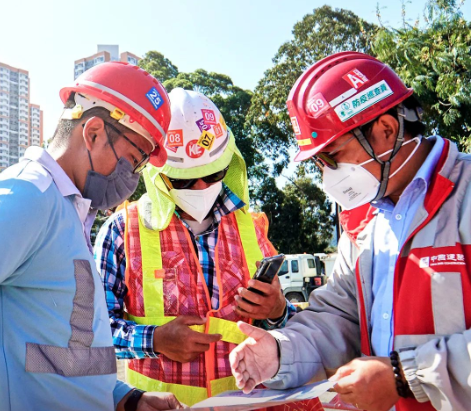 中國建筑國際集團參與中央援建香港的6所方艙項目建設。圖為工作人員在交流討論中。