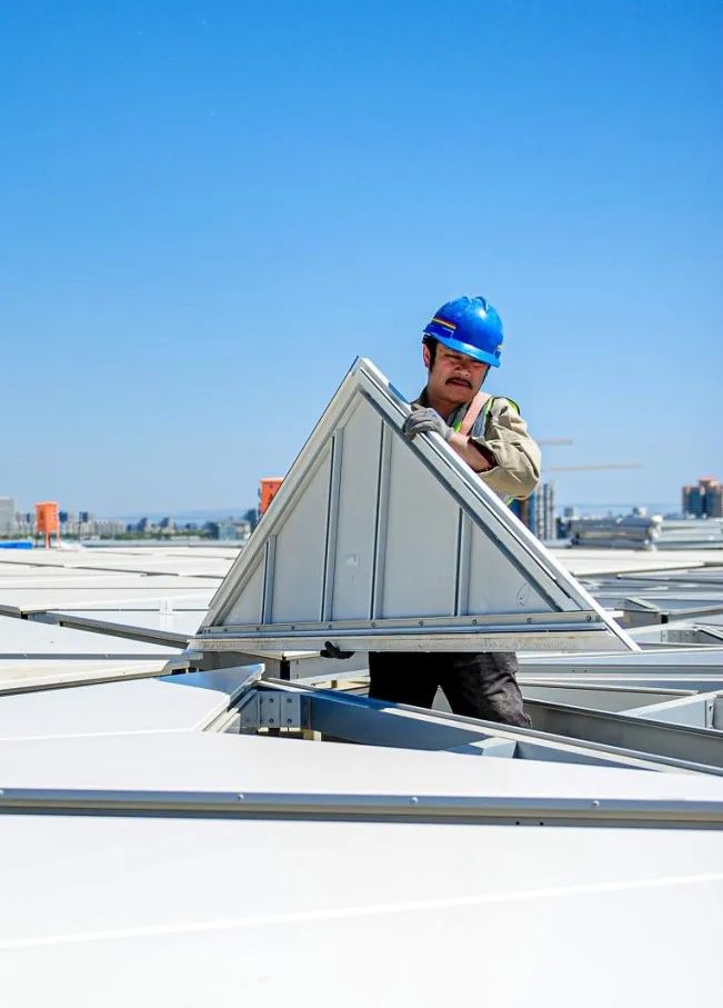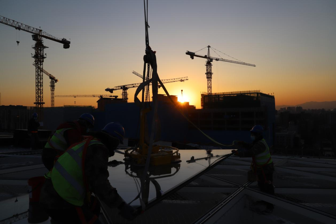 夕陽西下,國家會議中心二期幕墻工程,工人屋頂作業(yè)安裝三角形幕墻板塊。