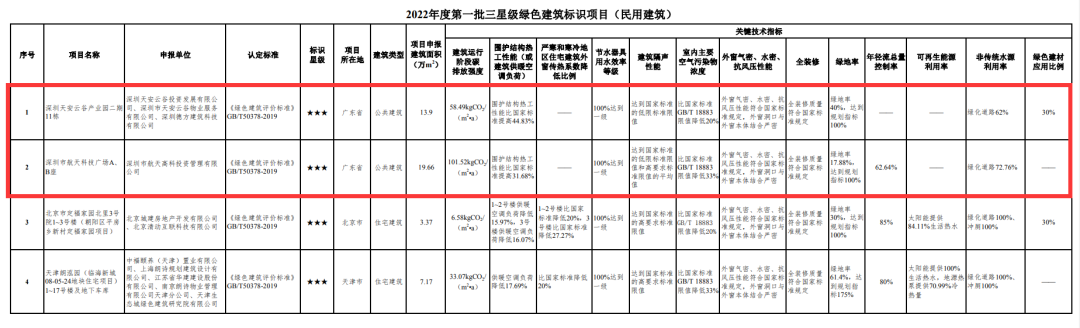 據(jù)公示文件,本批三星級(jí)綠色建筑標(biāo)識(shí)項(xiàng)目評(píng)審共有5個(gè)項(xiàng)目通過(guò)審查(4個(gè)民用建筑項(xiàng)目、1個(gè)工業(yè)建筑項(xiàng)目),其中包含“深圳天安云谷產(chǎn)業(yè)園二期11棟”、“深圳市航天科技廣場(chǎng)A、B座”2個(gè)深圳項(xiàng)目。