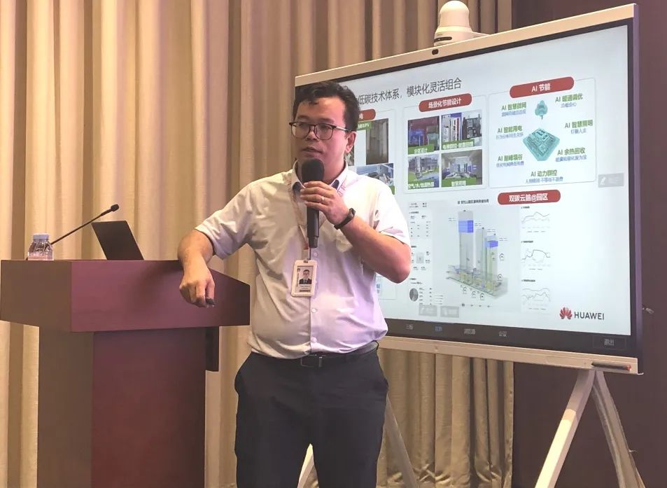 華為公司能源解決方案專家陳德全作《華為行業(yè)綠電,使能綠色低碳新時代》主題分享。他對華為綜合智慧能源業(yè)務(wù)進(jìn)行了系統(tǒng)全面的介紹,并針對與綠色建筑領(lǐng)域密切相關(guān)的低碳園區(qū)、低碳建筑兩個板塊的業(yè)務(wù)進(jìn)行重點(diǎn)闡述。他以華為數(shù)字能源安托山基地作為實(shí)例案例進(jìn)行分享,對打造近零碳園區(qū)、近零碳建筑以及打造光儲直柔示范提出華為方案。
