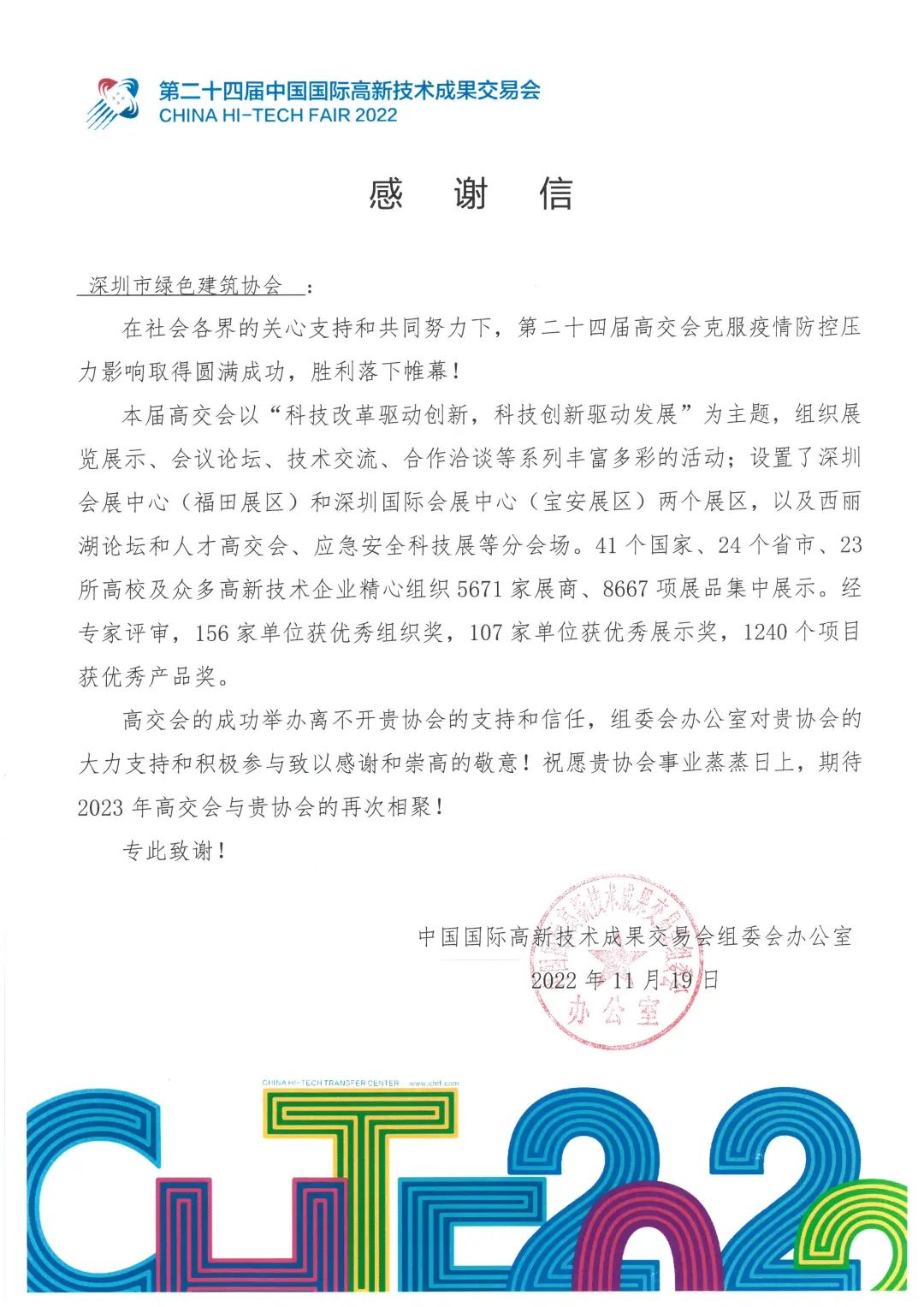 作為高交會“建筑科技創(chuàng)新展”合作組織單位,深圳市綠色建筑協(xié)會積極組織發(fā)動建筑行業(yè)企業(yè)參展,并在會期內(nèi)組織了綠色建筑產(chǎn)品與技術(shù)路演、“跑起來蓋個章”、“繪出我們的美好家園”等豐富多彩的活動,積極搭建行業(yè)展示平臺、擴大展區(qū)影響力。本屆高交會結(jié)束后,高交會組委會辦公室向協(xié)會發(fā)來感謝信,并頒發(fā)“優(yōu)秀組織獎”牌匾。
