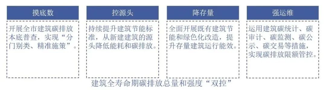從“摸底數(shù)、控源頭、降存量、強(qiáng)運(yùn)維”方面建立建筑全壽命期碳管控,運(yùn)用建筑碳統(tǒng)計、碳審計、碳監(jiān)測、碳公示、碳交易等措施,實(shí)現(xiàn)碳排放限額管控。