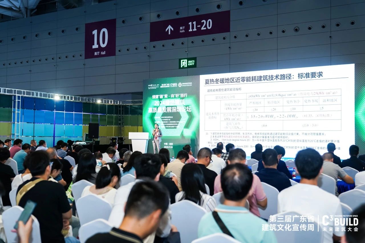 華南理工大學(xué)教授趙立華基于《近零能耗建筑技術(shù)標(biāo)準(zhǔn)》(GB/T 51350-2019)的相關(guān)規(guī)定和要求,介紹了夏熱冬暖地區(qū)近零能耗建筑技術(shù)路徑,分享廣東省的近零能耗與零能耗工程案例的主要技術(shù)和經(jīng)驗(yàn)。深圳市綠色建筑協(xié)會(huì)副會(huì)長(zhǎng)、深圳萬(wàn)都時(shí)代綠色建筑技術(shù)有限公司董事長(zhǎng)蘇志剛結(jié)合在綠色建筑領(lǐng)域的探索及實(shí)踐經(jīng)驗(yàn),提出“綠色金字塔”體系模型,將綠色建筑全生命周期發(fā)展路徑及其9個(gè)階段的價(jià)值完整呈現(xiàn)。深圳市特區(qū)建工科工集團(tuán)總工程師顧磊通過(guò)兩類(lèi)不同業(yè)態(tài)的裝配式建筑實(shí)踐,探索了裝配式建筑在綠色節(jié)能降碳領(lǐng)域的積極應(yīng)用。中國(guó)建筑標(biāo)準(zhǔn)設(shè)計(jì)研究院技術(shù)發(fā)展中心主任徐愷介紹了綠色建材的發(fā)展背景、現(xiàn)狀,并提出搭建世界范圍內(nèi)的建筑綠色供應(yīng)鏈條的發(fā)展思路。深圳市華寶新能源股份有限公司光伏產(chǎn)品研發(fā)總監(jiān)于華君在演講中表示,在國(guó)家大力發(fā)展可再生能源的背景下,該公司研發(fā)的創(chuàng)新產(chǎn)品致力于實(shí)現(xiàn)光伏技術(shù)與屋頂美學(xué)的深度融合。