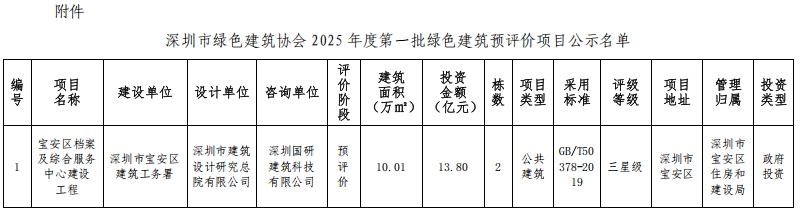 深圳市綠色建筑協(xié)會關(guān)于2025年第一批綠色建筑預評價項目的公示