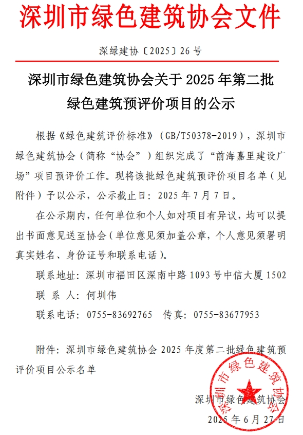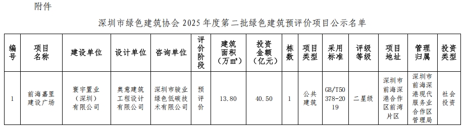 深圳市綠色建筑協(xié)會關于2025年第二批綠色建筑預評價項目的公示