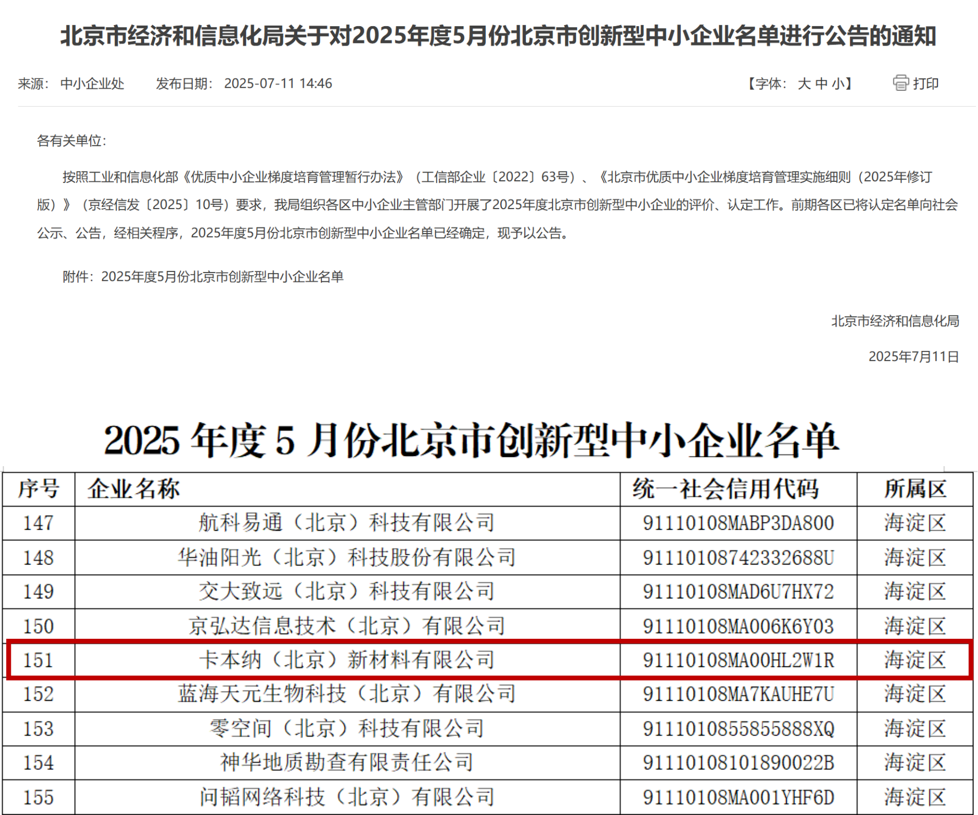 近日,北京市經(jīng)濟和信息化局公示了2025年度5月份北京市創(chuàng)新型中小企業(yè)名單,卡本納(北京)新材料有限公司憑借突出的創(chuàng)新力、成長性與專業(yè)化優(yōu)勢成功入選,榮獲“創(chuàng)新型中小企業(yè)”稱號。