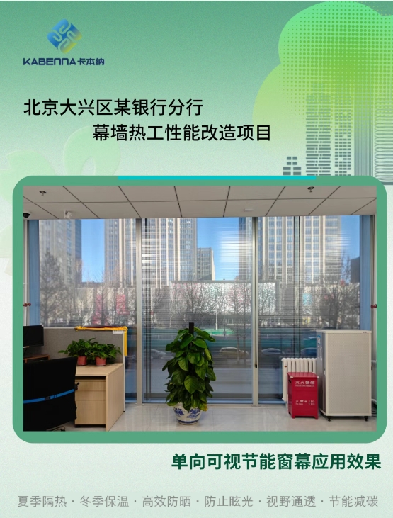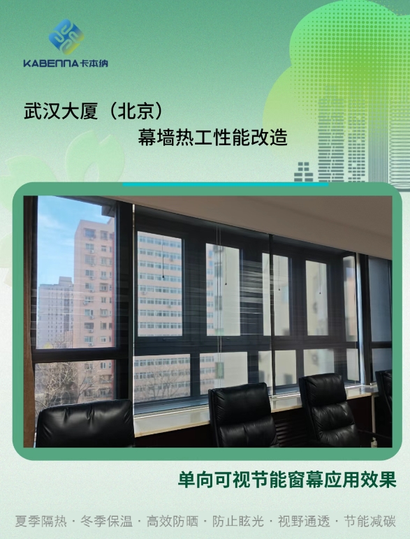 卡本納深耕建筑幕墻與窗節(jié)能改造領(lǐng)域,推出的單向可視節(jié)能窗幕,直擊幕墻與窗熱工性能衰退與不可調(diào)兩大核心痛點。窗幕通過先進納米膜材與控制組件實現(xiàn)幕墻熱工參數(shù)動態(tài)調(diào)節(jié),夏季減少40-50%室內(nèi)得熱、冬季減少20-30%室內(nèi)熱量流失,以主動調(diào)節(jié)機制逆轉(zhuǎn)性能衰減趨勢,從根本上破解建筑能耗攀升、熱舒適性差等頑疾。作為2021年獲國家發(fā)明專利的革命性成果,其創(chuàng)新價值獲多項權(quán)威認證背書:通過住建部建設行業(yè)科技成果評估、斬獲北京市五部委聯(lián)合頒發(fā)的新技術(shù)新產(chǎn)品證書、入選北京市發(fā)改委綠色低碳先進技術(shù)推薦目錄。目前窗幕已應用于全國200余個幕墻改造項目,被業(yè)內(nèi)專家、設計師和業(yè)主廣泛認可,既以技術(shù)突破印證創(chuàng)新實力,更憑市場滲透力彰顯強勁發(fā)展?jié)摿Γ掷m(xù)贏得客戶高度贊譽。
