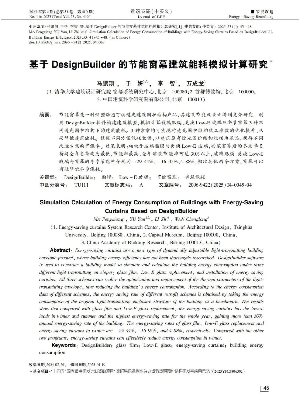 近日,由卡本納(北京)新材料有限公司、首都博物館與中國(guó)建筑科學(xué)研究院聯(lián)合開(kāi)展的節(jié)能窗幕研究成果——《基于DesignBuilder的節(jié)能窗幕建筑能耗模擬計(jì)算研究》,正式發(fā)表于中國(guó)科技核心期刊《建筑節(jié)能(中英文)》。該成果獲得了“ 十四五” 國(guó)家重點(diǎn)研發(fā)計(jì)劃“遮陽(yáng)與保溫性能獨(dú)立調(diào)節(jié)透明圍護(hù)結(jié)構(gòu)研發(fā)與應(yīng)用示范”的專(zhuān)項(xiàng)支持,為建筑節(jié)能領(lǐng)域提供了創(chuàng)新性解決方案。