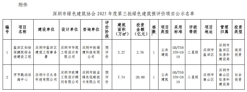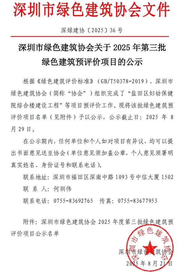 深圳市綠色建筑協(xié)會(huì)關(guān)于2025年第三批綠色建筑預(yù)評(píng)價(jià)項(xiàng)目的公示
