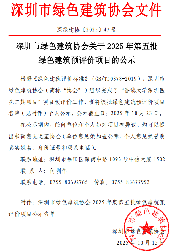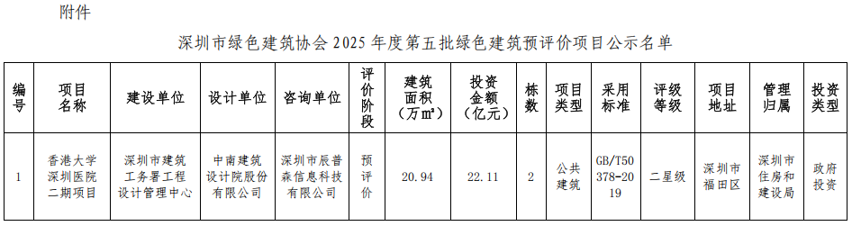 深圳市綠色建筑協(xié)會關(guān)于2025年第五批綠色建筑預評價項目的公示