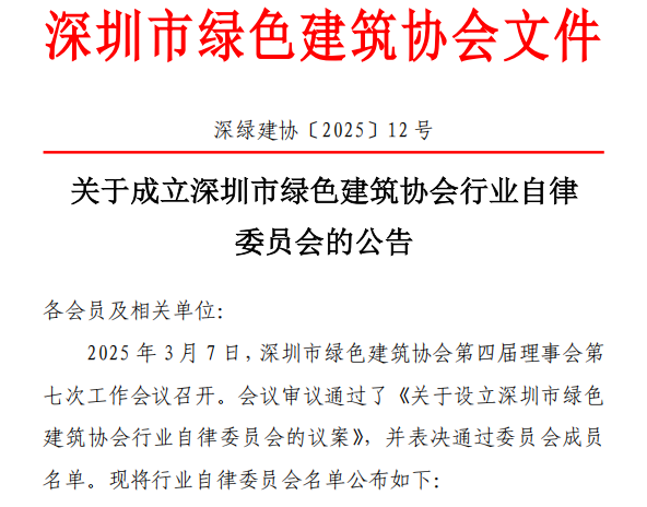 2025年,協(xié)會(huì)設(shè)立行業(yè)自律委員會(huì),審議通過《深圳市綠色建筑協(xié)會(huì)行業(yè)自律委員會(huì)工作規(guī)則》,進(jìn)一步夯實(shí)行業(yè)誠(chéng)信自律發(fā)展根基;并將“行業(yè)自律”納入會(huì)長(zhǎng)聯(lián)席會(huì)議、專業(yè)委員會(huì)主任工作會(huì)議等重要會(huì)議的核心議題,探索行業(yè)誠(chéng)信自律建設(shè)工作實(shí)施路徑。
