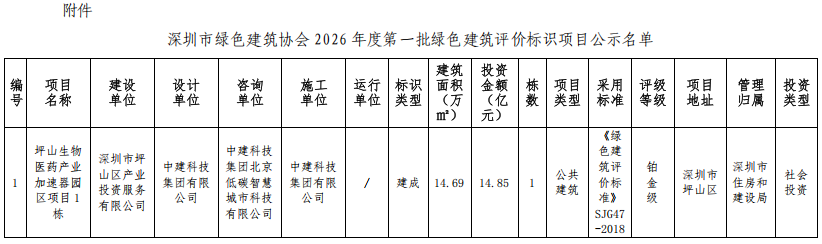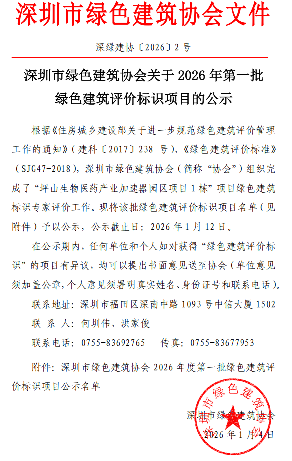 深圳市綠色建筑協(xié)會關于2026年第一批綠色建筑評價標識項目的公示