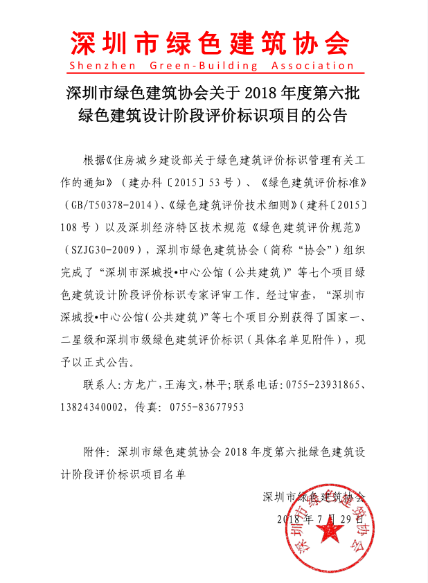 關(guān)于2018年度第六批綠色建筑設(shè)計階段評價標識項目的公告